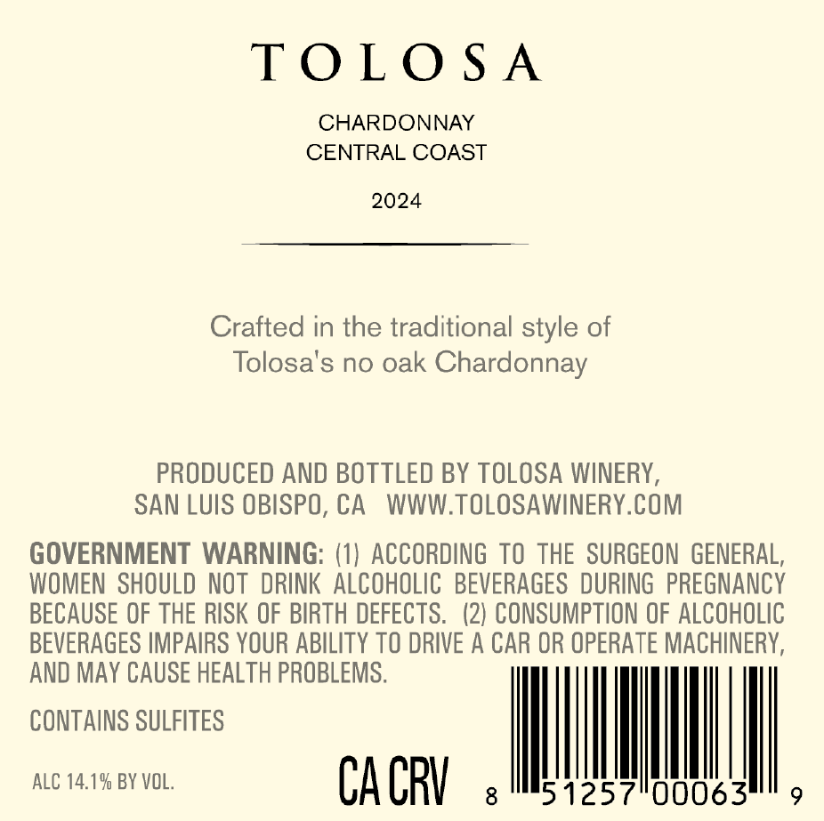 Made in the style of Tolosa No Oak Chardonnay.